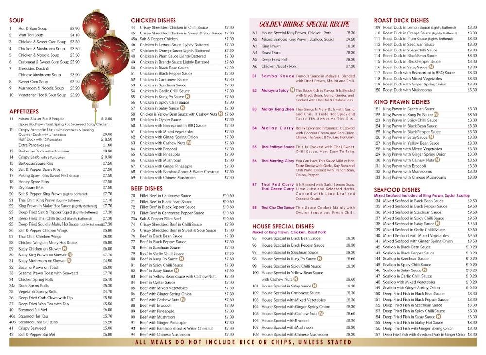 Golden Bridge’s menu reflects a rich and diverse selection of dishes, offering a total of 238 plates for guests to savor. The appetizers are a perfect starting point, featuring favorites like barbecue spare ribs and prawn toast. For those who crave chicken, the crispy shredded chicken in sweet and sour sauce is a standout, while beef lovers can enjoy fillet beef in black bean sauce. Vegetarians will also find enticing options such as deep-fried beancurd meticulously prepared with different flavors.